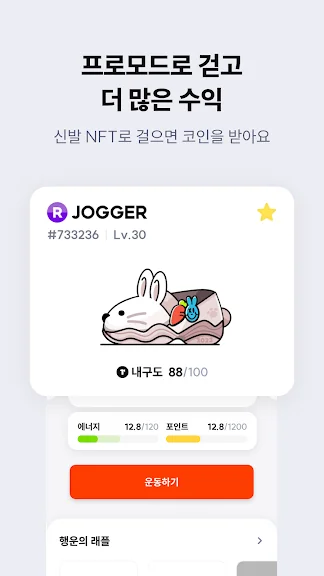 나만의 신발을 레벨 업 하면서 WALK 코인을 얻을 수 있어요. 진정한 앱테크를 원한다면 신발 NFT를 구매해서 프로모드로 운동하고 WALK 코인을 받으세요. 가장 저렴한 NFT를 구매해도 15분만 걸으면 평균 1,500원을 벌어요. 프로모드로 걷고 앱테크 하세요.