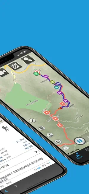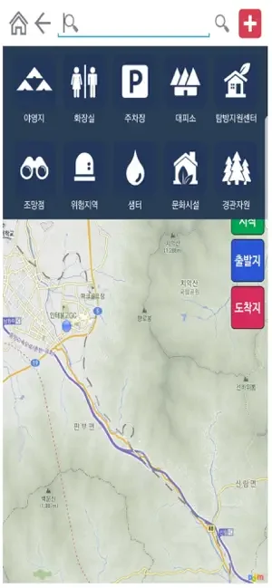 - 등산 내비게이션 (경유지, 도착지 선택 후 경로계산과 음성안내) 기능 제공