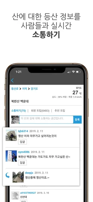 안전지수와 난이도를 고려한 코스검색, 트래킹 기능, 날씨정보, 조난신고 등