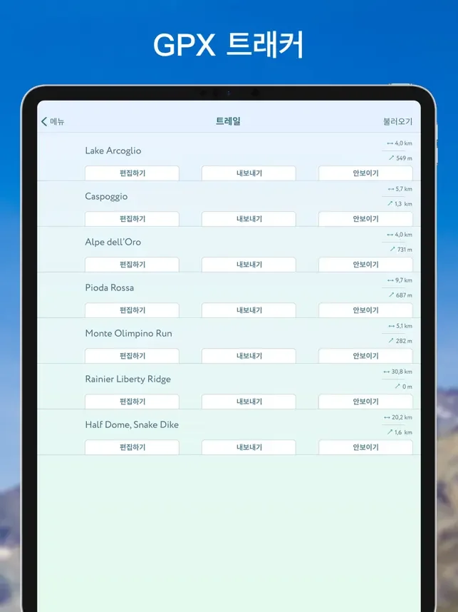 통계도 볼 수 있습니다. 또한 이 앱을 통해서 GPX 파일을 가져오고 내보낼 수 있습니다.