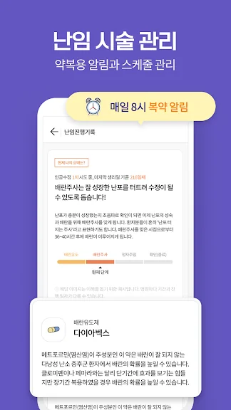 4) 난임 전문의가 감수한 시술 과정별 설명과 약물 알림까지! 어렵게만 느껴지는 난임 시술도 쉽게 기록해보세요.