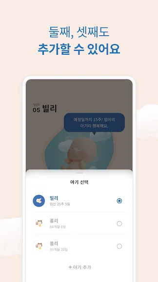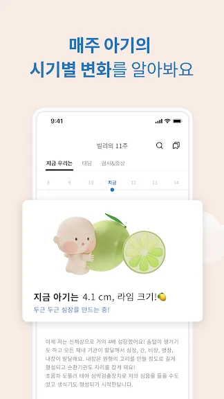 임신 주수에 따라 성장하는 아기의 일러스트는 앱을 열 때마다 귀여운 몸짓을 다양하게 보여줍니다. 아기를 탭하면 말을 합니다. 이 대사는 매일 바뀌면서 아기의 모습이나 응원 메시지를 전해줍니다.