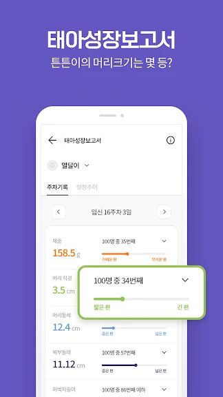 3) 몸무게, 머리둘레 등 5가지 태아성장수치를 통해 뱃속에서 잘 크고 있는지 그래프로 확인하세요.