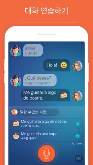 이 앱은 두 사람의 기본적인 대화로 시작됩니다. 신속하게 핵심 스페인어 단어를 외우고 이 단어로 문장과 구를 만들어봅니다. 45분의 수업이 끝나면 회원님의 목소리로 이 대화를 재구성해 볼 수 있게 됩니다. 스페인어 문장을 공부하는 아주 효율적인 방법입니다. 최신 음성 인식 기능과 분산 학습 알고리즘을 통해 더 효과적으로 언어를 학습할 수 있습니다.