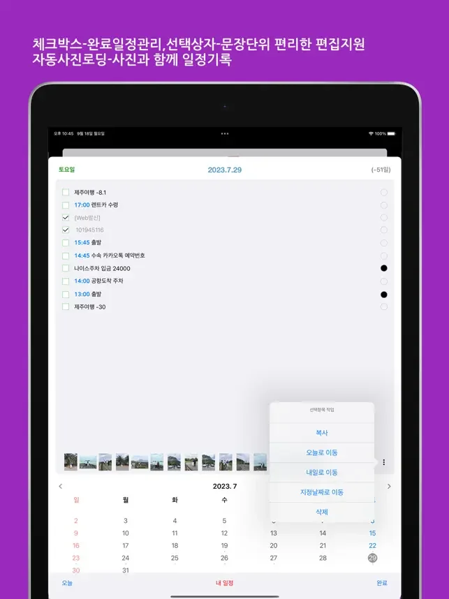 글자수에 따라 크기가 자동변경되는 입력창과 메모형태로 쉽게 많은 일정들을 기록할 수 있습니다
