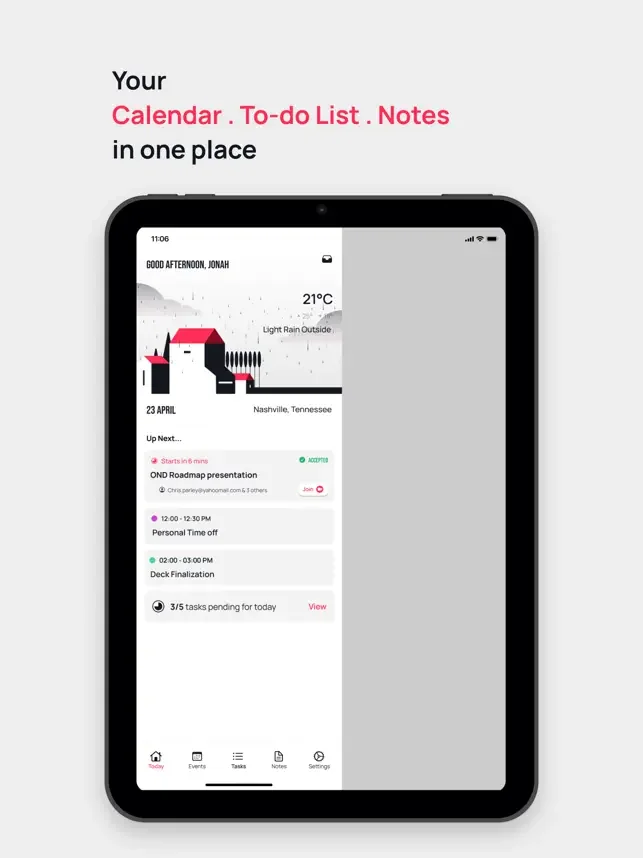 to.day는 생산성에 대한 새로운 시도입니다. 하루 일정과 관련된 모든 것을 한 곳에 모아두는 간단하면서도 강력한 앱입니다. 캘린더와 회의를 관리하고, 하루를 계획하고, 모두 같은 앱에서 메모할 수 있습니다.