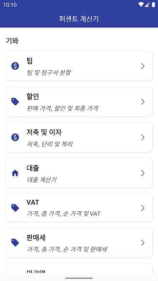 ▶️ 응용 프로그램은 화면 맨 위에 있는 네비게이션(계산 백분율 아래)을 클릭해서 원하는 백분율을 선택해서 계산할 수 있습니다.